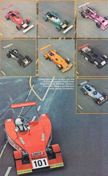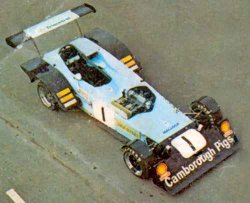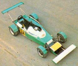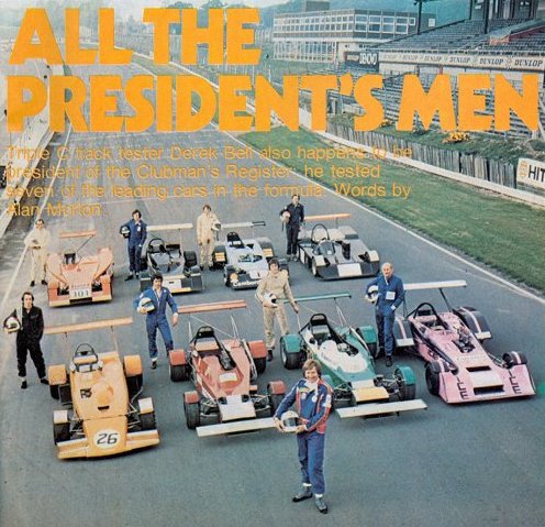 ex- F1 car !He had various trials and tribulations with the cars but by the end of the day we both had a clear impression of what Clubmans is all about. Everyone was jolly and humour was rife (what can you expect from people who call their cars silly names like Pink Panther ?). Derek's comments were straight from the shoulder; that's what they wanted because all the teams realised they weren't professionals and didn't try to pretend they were. For example, after Derek's praise, Tony Norton admitted that the only reason he had put a rear wing on the car was because his wife told him it would look silly without one ! Jim Yardley kept quiet about the fact that his steering wheel moved towards you under braking and Derek wasn't sure whether that was better than the offset steering wheel in the Panther or not! He was sure he preferred brakes though, as one team kindly fitted new pads but didn't have time to bed them in properly, resulting in Mr Bell approaching Druids rather rapidly. He said. "The last time I was here I ran an F1 car into the bank at Druids and I can still see the red mark. I didn't want to end up there again." "Overall though, the cars are tremendously well built and I have the greatest admiration for people who can construct cars to such a high standard with little or no technical training. A lot of good ideas have gone into them and they are very fast and competitive cars." "They have improved a hell of a lot since I first tested them two seasons ago, but funnily enough, I wasn't surprised at how quick they were. I couldn't believe it the first time I drove them, but this year I suppose, I had built myself up to expect lots of speed." "My only overall judgement is that they are getting too tied up with things that don't matter (like aerodynamics), when they haven't sorted out the basics of the car. They end up getting confused and developing in the wrong direction. Even so, their efforts are remarkable and I enjoyed myself a hell of a lot." Clubmans people being the types they are, I don't think he could have failed to do that ! |